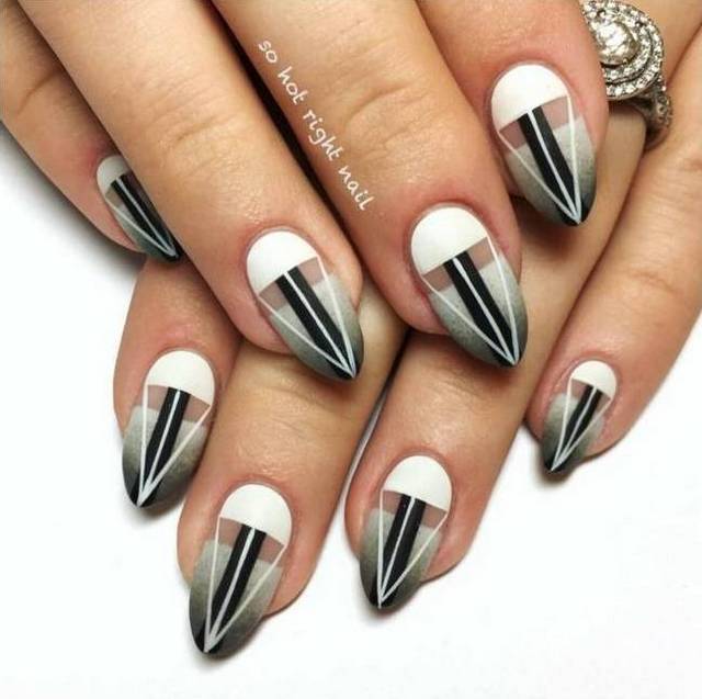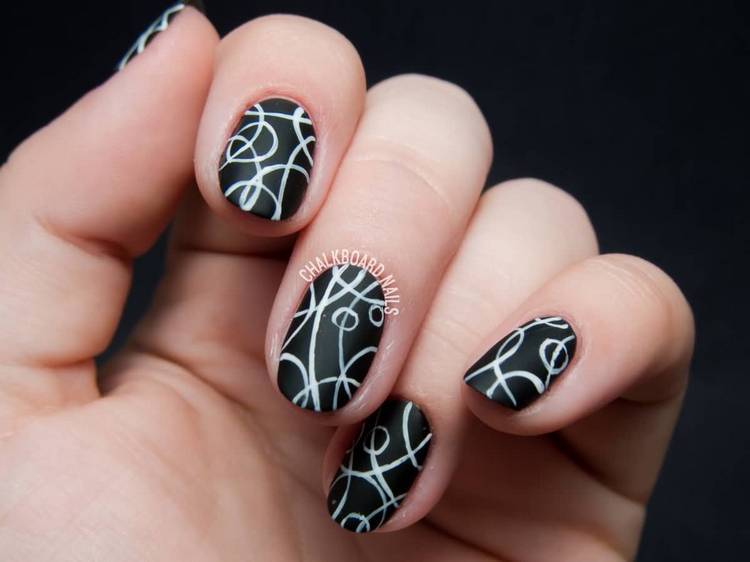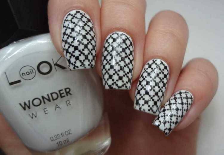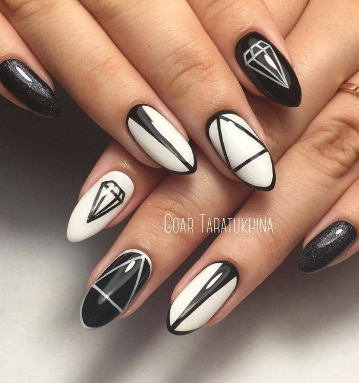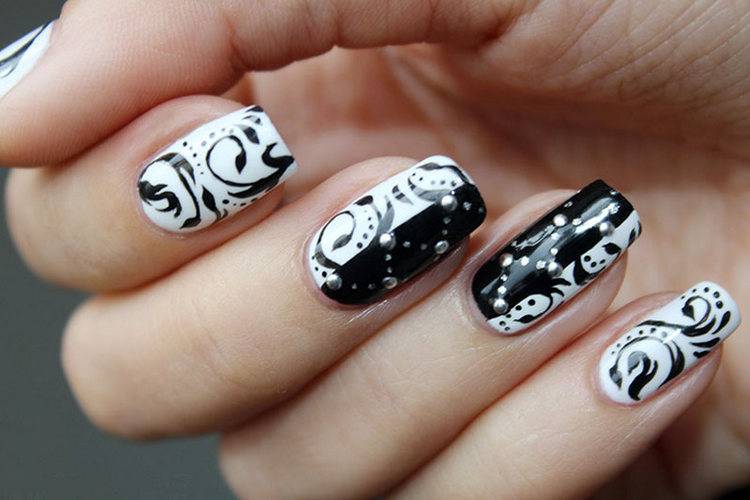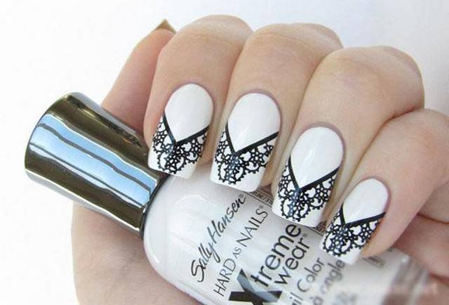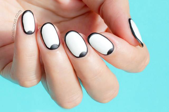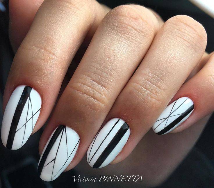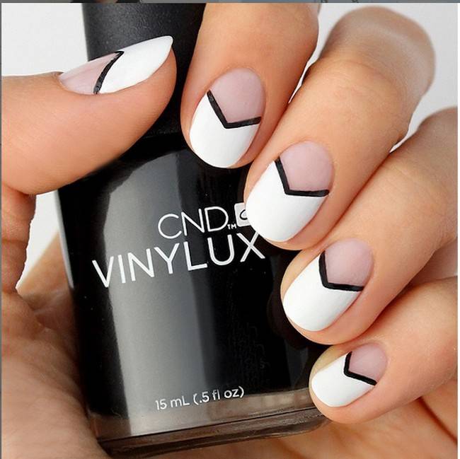 Во-первых, вы можете использовать белую основу с чёрным орнаментом, с помощью которого можно создать более утончённую форму ногтя и визуально удлинить его.