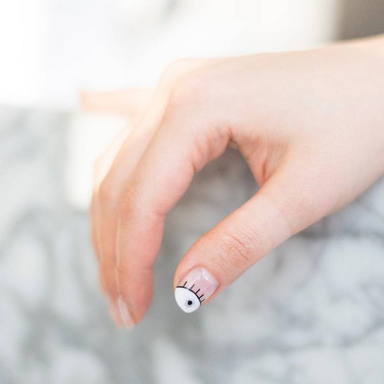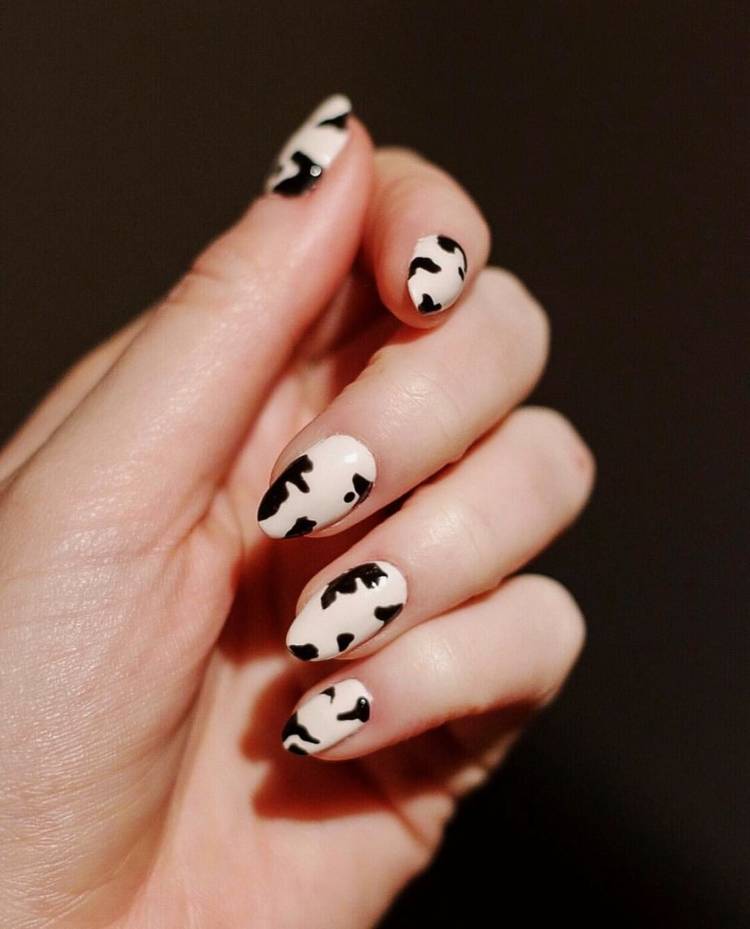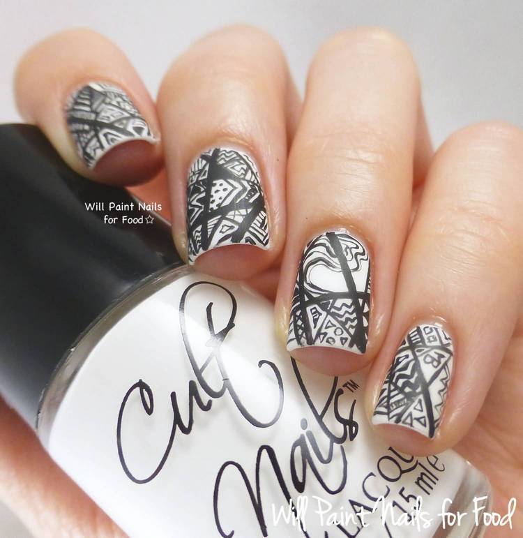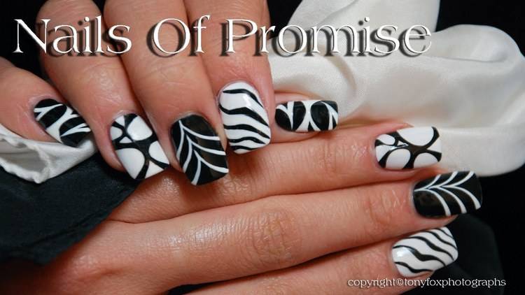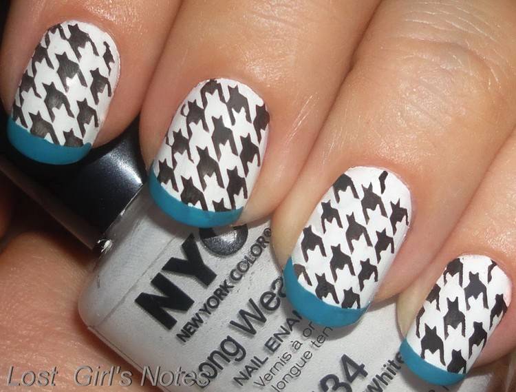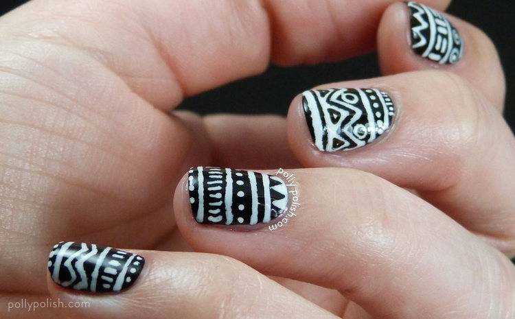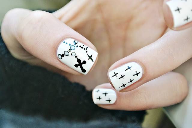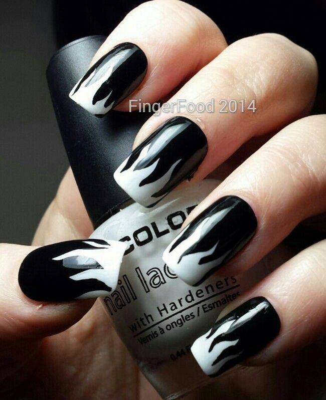 Во-первых, вы можете использовать белую основу с чёрным орнаментом, с помощью которого можно создать более утончённую форму ногтя и визуально удлинить его.