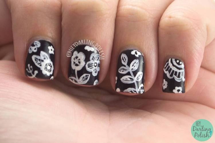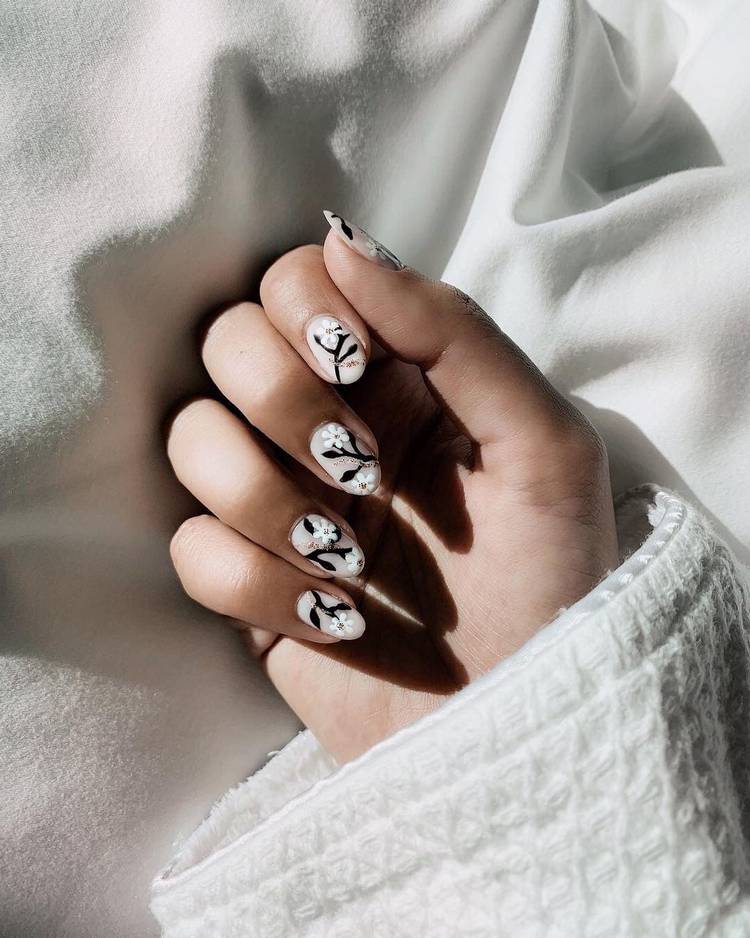 Помимо геометрических рисунков на ногтях не менее стильно смотрятся цветочные орнаменты или животный принт, выполненные в черно-белой гамме. Это может быть и этнический дизайн ногтей, и просто красивые завитушки. Мы собрали наиболее интересные фото черно-белого маникюра с рисунками.