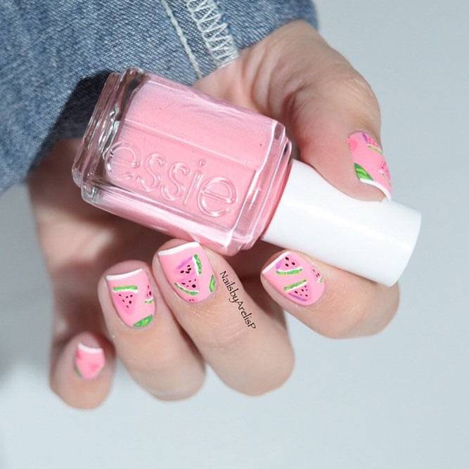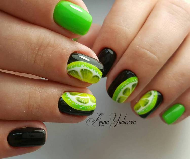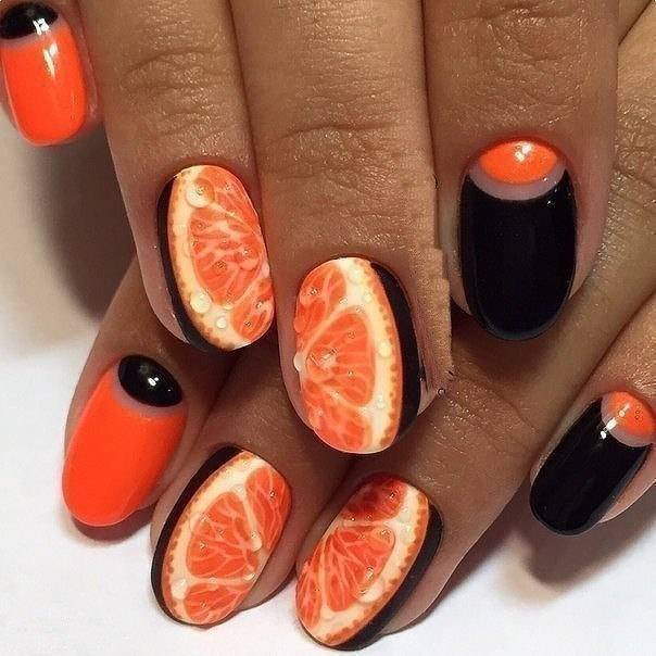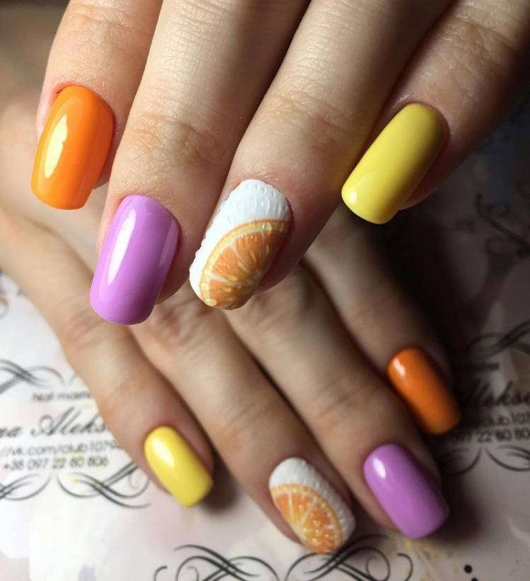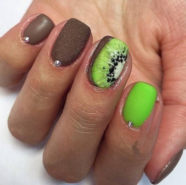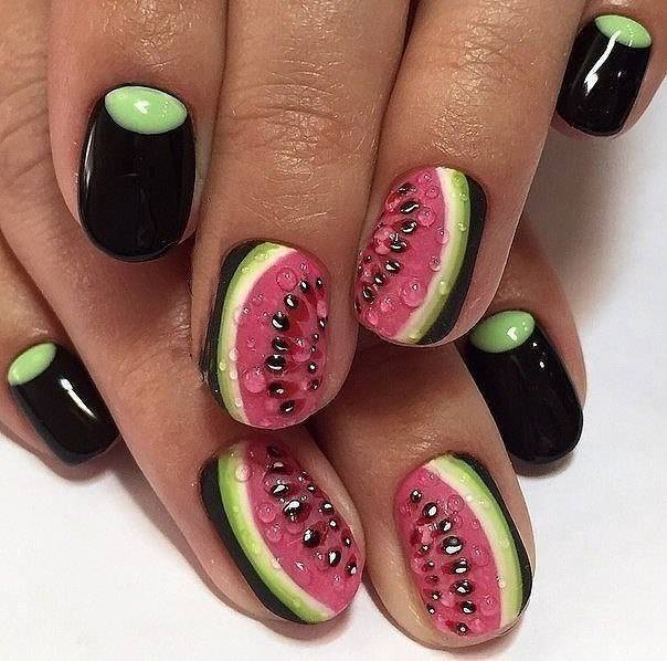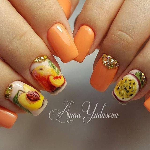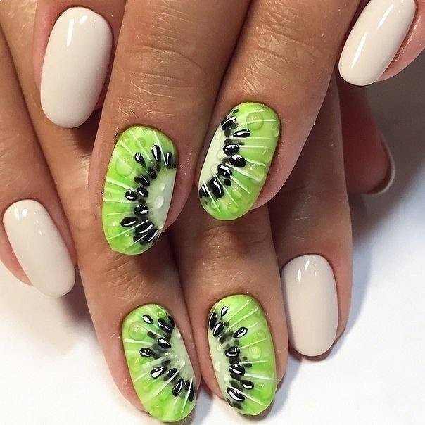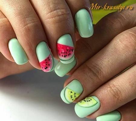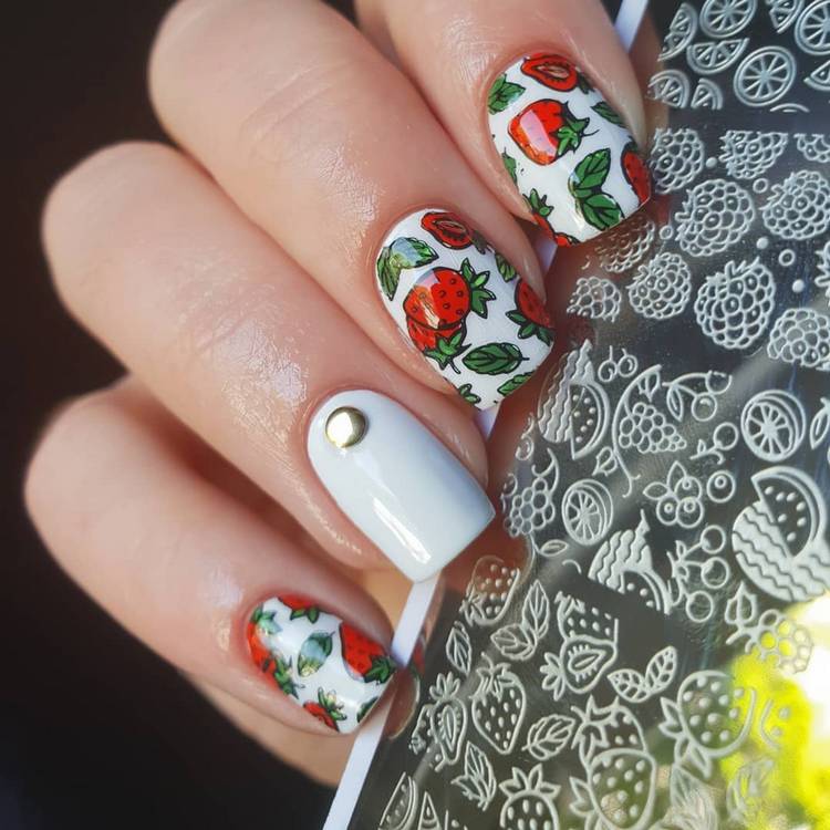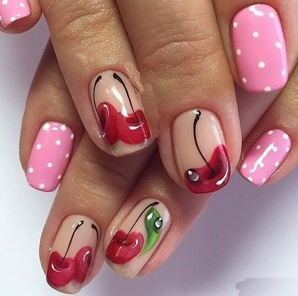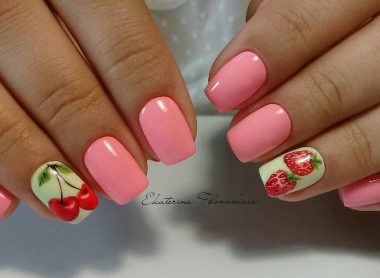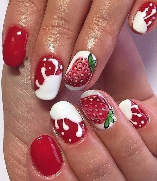 Літня пора багата на різні дари природи. Не дивно, що модний літній манікюр у цю пору року нерідко прикрашають різноманітні фрукти та ягоди. Насамперед це полуниця, вишня, малина, але не забуваємо також про соковиті цитрусові: лимон, апельсин, лайм. Літні нігті прекрасно підкреслюють малюнки солодощів: макарунів, морозива, шоколадного печива. Подібні ідеї мають дуже бешкетний вигляд і особливо припадуть до вподоби креативній молоді.