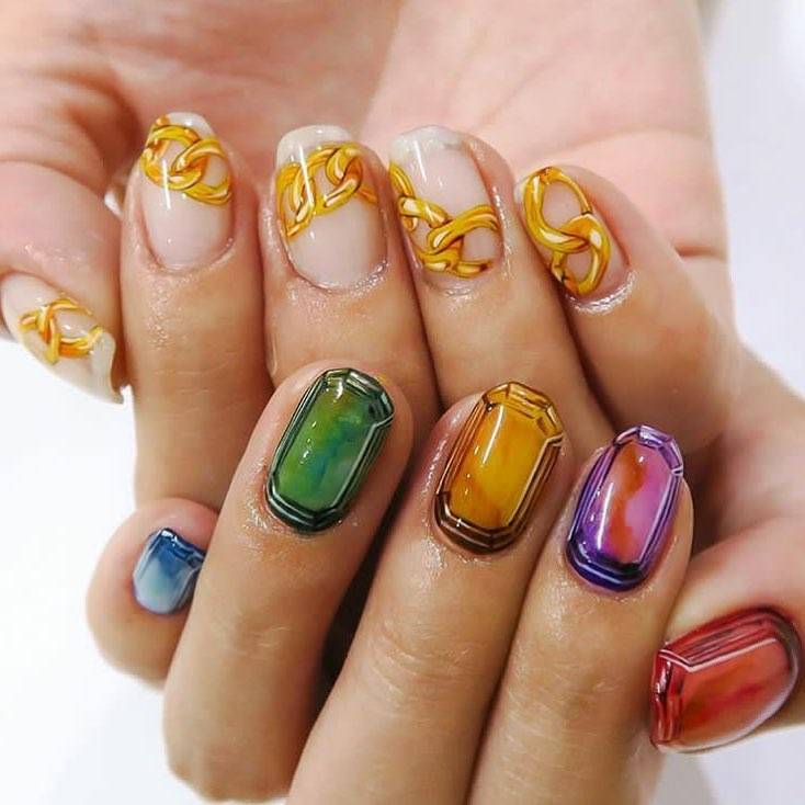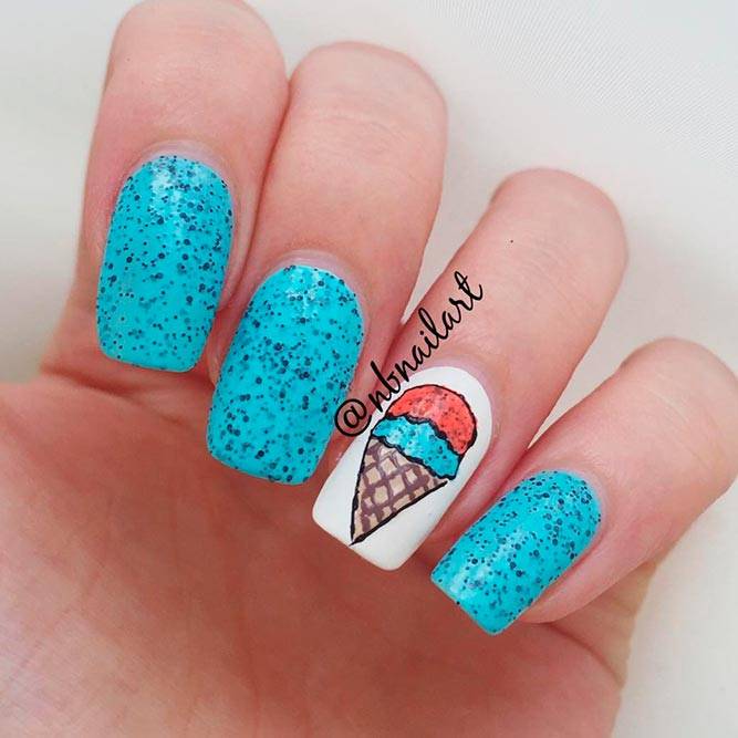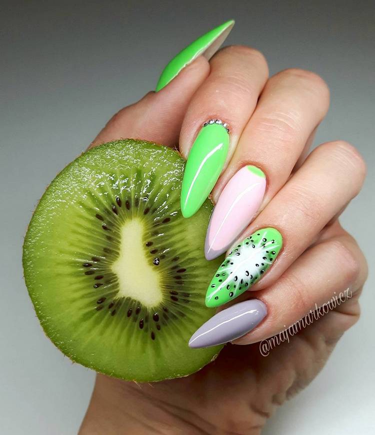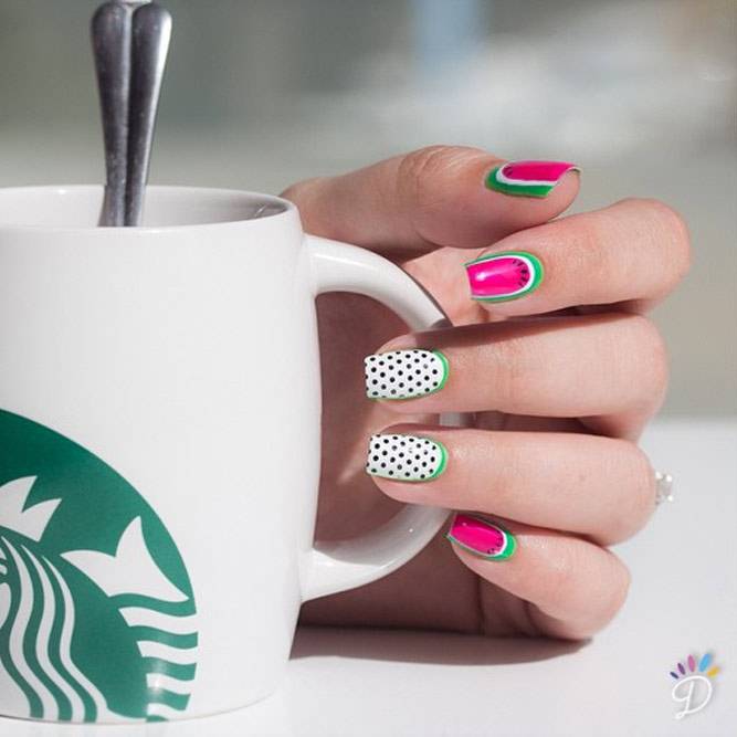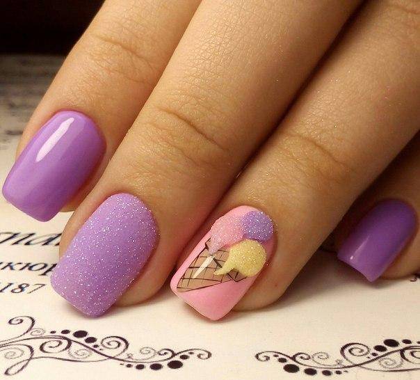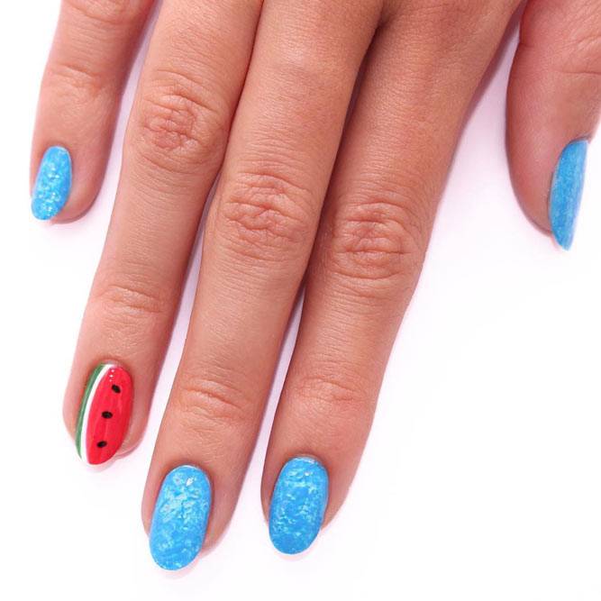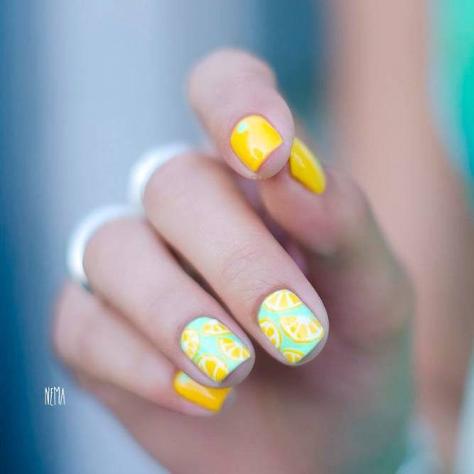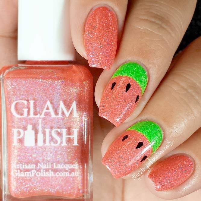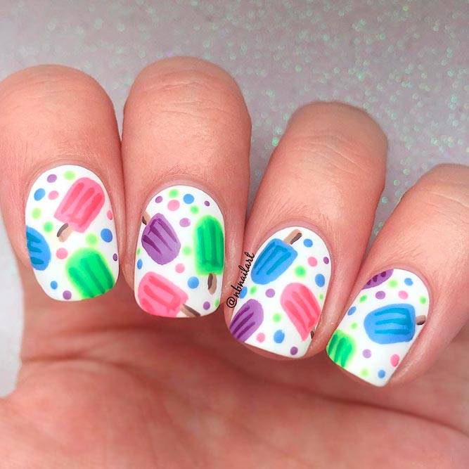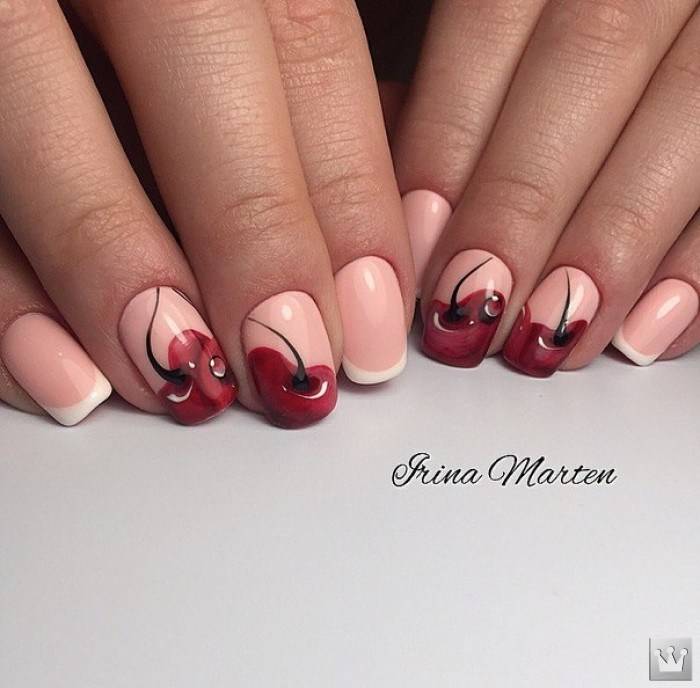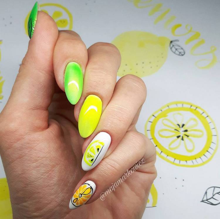 Літня пора багата на різні дари природи. Не дивно, що модний літній манікюр у цю пору року нерідко прикрашають різноманітні фрукти та ягоди. Насамперед це полуниця, вишня, малина, але не забуваємо також про соковиті цитрусові: лимон, апельсин, лайм. Літні нігті прекрасно підкреслюють малюнки солодощів: макарунів, морозива, шоколадного печива. Подібні ідеї мають дуже бешкетний вигляд і особливо припадуть до вподоби креативній молоді.