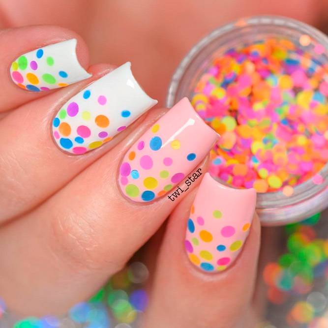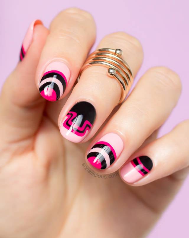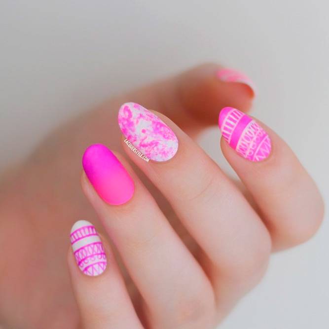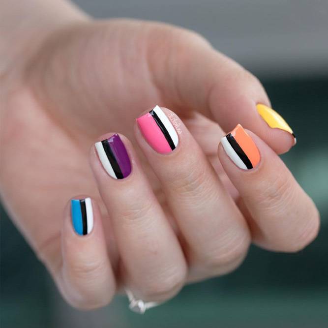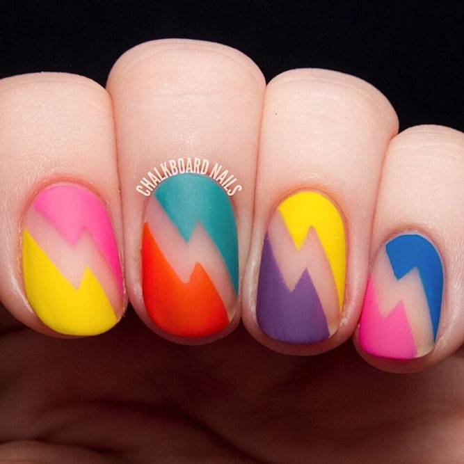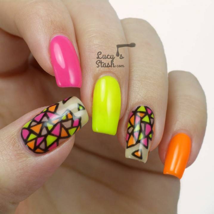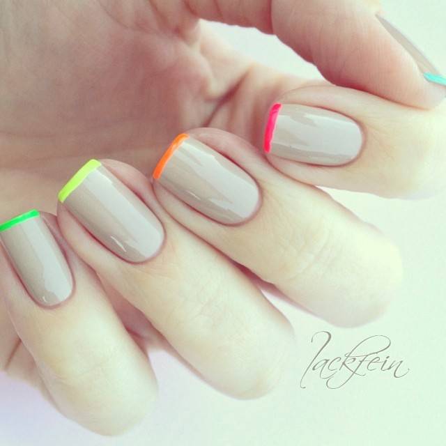 Дівчатам, які не бояться привертати до себе увагу оточуючих, радимо звернути увагу на найпомітніші та наймодніші літні нігті. Створити яскравий літній манікюр найпростіше за допомогою різних неонових відтінків. Він буде ще більш помітним, якщо використовувати кілька контрастних тонів. Літні дизайни манікюру в невеликій кількості можуть містити й темні кольори. Однак на відміну від зимового манікюру, вони тут не відіграють головної ролі. Яскравий літній манікюр, як на фото - це чудова ідея як для відпочинку, так і для веселого проведення часу в межах міста.