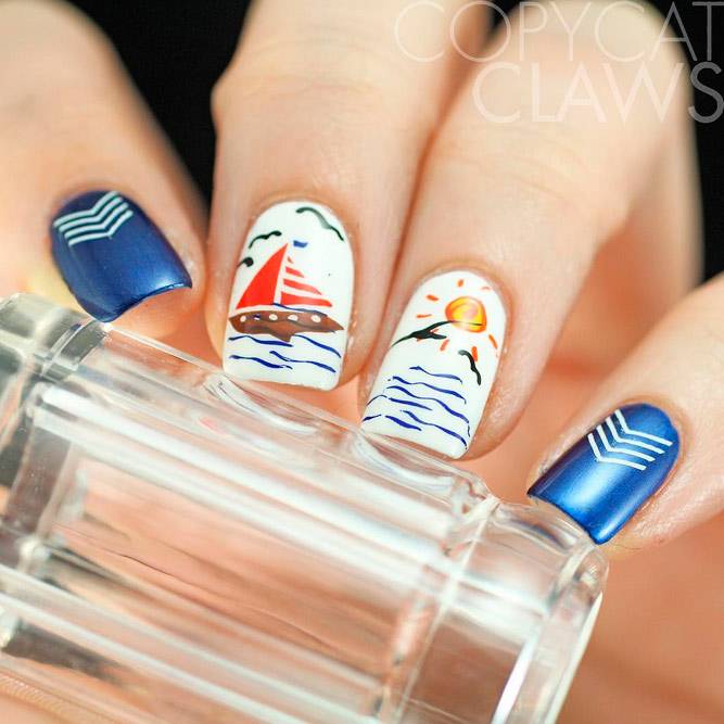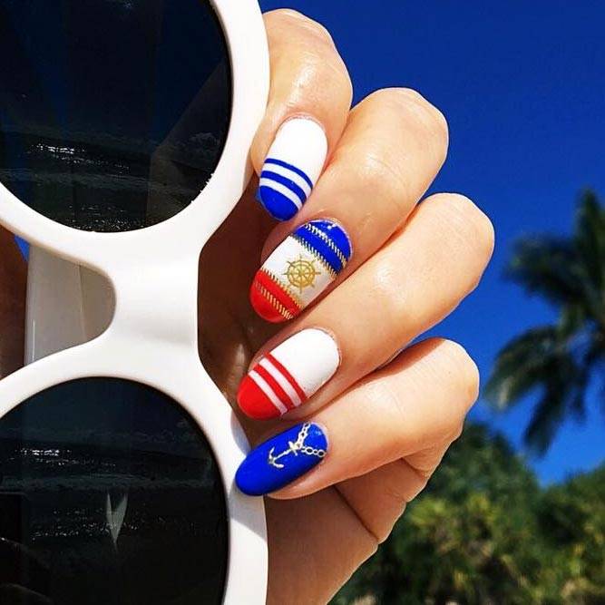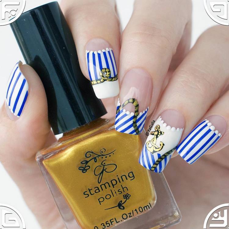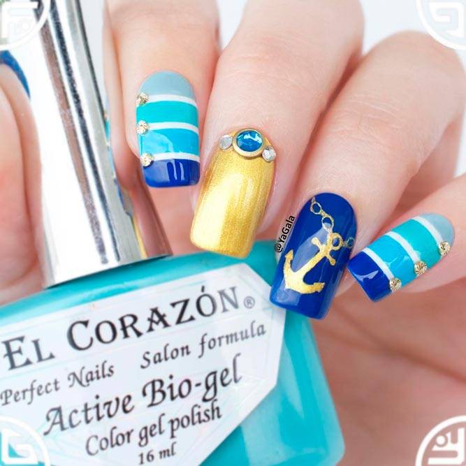 Ідеї манікюру в морському стилі - справжня класика в літньому дизайні нігтів. Вони особливо актуальні, якщо ти вирушаєш у теплі краї до моря або океану. Морський манікюр - це малюнки якоря, компаса, корабликів, черепашок, чайок, а також нестаріюча тільняшка. Переважаючі кольори - синій, блакитний, чорний, білий. Такі літні нігті з морською тематикою воістину вражають.
